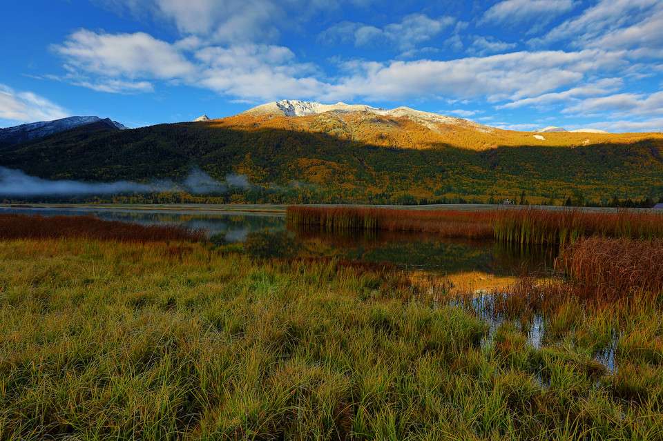 鴨澤湖位于禾木喀納斯蒙古族鄉(xiāng)境內(nèi)喀納斯村南邊,它是由喀納斯河改道后廢棄河段——牛軛湖洼地組成,呈長形蝶狀,沿洼地南端形成一個(gè)南北走向的寬淺湖泊,形似蝶狀的一弘碧水與沼澤濕地連為一體,面積約1.3 平方公里。