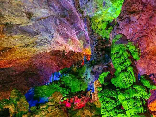 通過一道光潔的,地面上像砌滿了云片似的走廊后,(即為“臥龍壩”)就來到了第二景區(qū)——龍宮。壩上有二龍?bào)捶[甲浮動(dòng),閃閃發(fā)光,仿佛觸之即飛。過“溜馬槽”則為“黃龍灘”,中有仙人“煉丹井”,深不可測(cè)。設(shè)有“仙人床”,床頭有“仙人枕”,壁上有“仙人燈”,床下有“仙人履”。內(nèi)壁角有一小洞,高闊不足1米,深約1.7米,游人爬行而過,是全洞最狹窄的地方,因涼風(fēng)習(xí)習(xí),故稱“風(fēng)洞”。