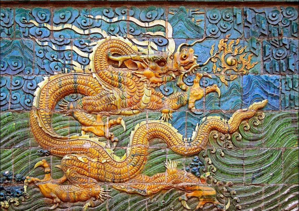壁高8米,厚2.02米,長(zhǎng)45.5米,僅壁身的九龍壁主體,高度就有3.72米。壁上均勻協(xié)調(diào)地分布著9條飛龍,以飛騰之勢(shì),躍然壁上,活靈活現(xiàn)。正中一條龍,是九龍的中心,它龍頭向前,龍尾擺動(dòng),黃色的主體,鱗光閃爍。主龍兩側(cè)的兩條龍互相對(duì)稱(chēng),構(gòu)成一幅生動(dòng)的畫(huà)面。龍的間隙由山石、水草圖案填充,互相映照、烘托。壁身兩側(cè)為日月圖案,由426塊特制五彩琉璃構(gòu)件拼砌而成,壁頂覆蓋琉璃瓦,頂下由琉璃斗拱支撐。壁底為須彌座,高2.09米,敦實(shí)富麗,上雕41組二龍戲珠圖案。腰部由75塊琉璃磚組成浮雕,有牛、馬、米、狗、鹿、兔等多種動(dòng)物形象,生動(dòng)活潑,多彩多姿。整個(gè)九龍壁構(gòu)圖協(xié)調(diào),比例適當(dāng),風(fēng)格古樸、穩(wěn)重、端莊。