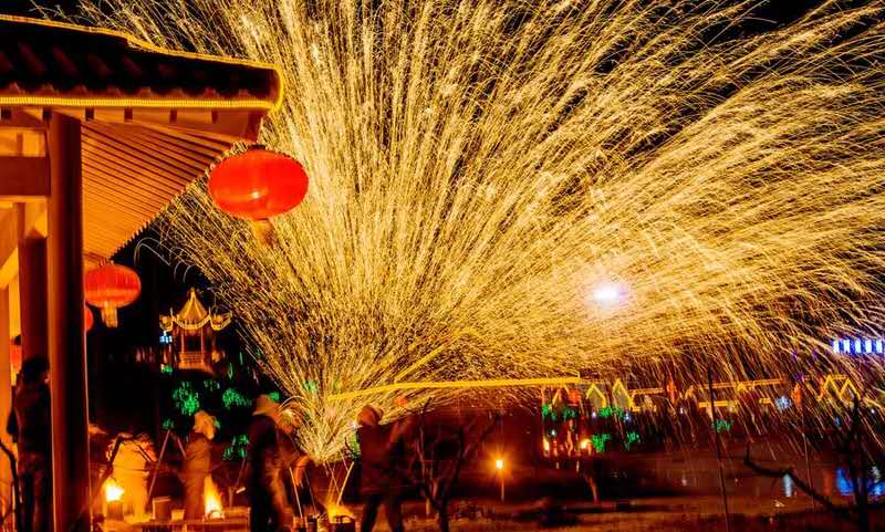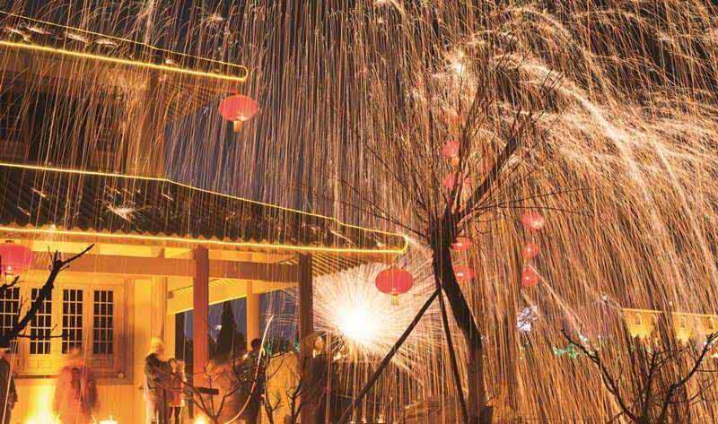夜幕降臨時才是文化節(jié)的高潮部分,春節(jié)期間,省級非物質(zhì)文化遺產(chǎn)千年絕技“打鐵花”在司徒小鎮(zhèn)內(nèi)的人工湖廣場精彩上演,民間匠人用熔爐將生鐵熔化成數(shù)千攝氏度的鐵汁,拋起用力擊向天空,朵朵鐵花如天女散花,絢麗奪目,夜空之下,火星璀璨,帶來的是紅火和驚詫,也帶來了希望與憧憬,吸引大量游客前來觀看。最高峰時期,單日游客量最高達十五萬人,創(chuàng)造了多項晉城市城區(qū)景區(qū)接待量的新記錄,令周邊游客度過了一個熱熱鬧鬧的新年。