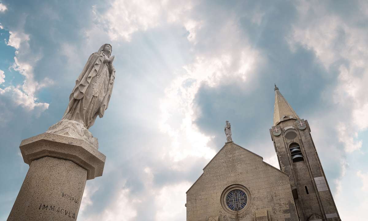 教堂前是一片寬廣平臺(tái),平臺(tái)盡處豎立一尊大理石雕刻而成的圣母像,圣母雙手合十,貌甚慈祥,面臨大海。平臺(tái)下有一路德圣母巖洞,循左右環(huán)抱之石階而下,即達(dá)洞前。版權(quán)所有山東聊城聊之旅國(guó)際旅行社有限公司,轉(zhuǎn)載必究!洞內(nèi)巖石嶙峋,中開拱門,內(nèi)立圣母像,象征古時(shí)圣母在法國(guó)路德城內(nèi),當(dāng)眾顯靈的情景。其間正置祭壇,洞前有鐵柵圍繞,地上設(shè)有多排低矮的長(zhǎng)石板,供教徒跪拜,懺悔。