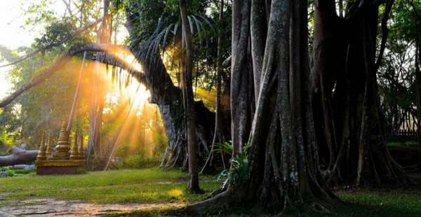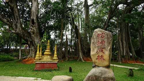 獨樹成林位于打洛鎮(zhèn)邊境貿(mào)易區(qū)內(nèi)的曼掌寨子旁,距離打洛鎮(zhèn)政府以南3.5公里,靠近中緬邊境的地方。這是一棵古榕樹,有900多年的樹齡,共有34個根立于地面,樹高50多米,樹幅面積2000多平方米,枝葉既像一道籬笆,又像一道綠色的屏障,成為熱帶雨林中的一大奇觀,打破了“單絲不成線,獨樹不成林”的俗語。