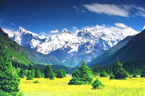在庫爾德寧闊谷向南方眺望,晴空麗之下,一座白雪皚皚,勢如劍挺,雄居群山之上的高大山峰就是喀班巴依峰。喀班巴依峰海撥4257米,是那拉提山肪最高峰,也是伊犁著名山峰之一。