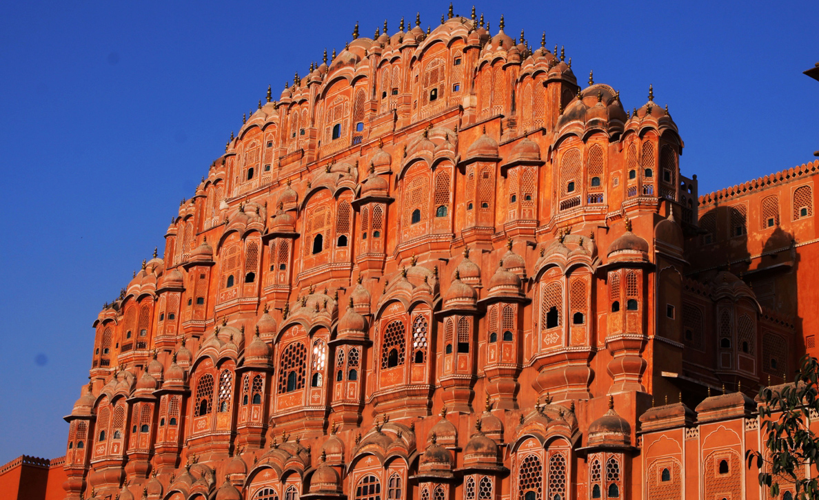 市中心有座純印度風格的古建筑臨街矗立,這就是齋普爾的象征——風宮。它是一座粉紅色半圓形5層建筑,頂部一座座拱形圓塔,彼此相連,宛如一座塔山。正面有無數扇用紅砂巖鏤空雕成的八角形窗戶,密如蜂巢,拱形窗楣,雕以各式圖案,十分精美。據傳,這里是供古代后妃登臨眺望全城景色的。版權所有山東聊城聊之旅國際旅行社有限公司,轉載必究!如今,游客登臨風宮,俯瞰全城,但見那片粉紅色的建筑群,川流不息的人力車、自行車和出租三輪車(汽車很少),宛如一條條長龍在婉蜒游動,一頭頭氣宇軒昂的駱駝牽拉著一輛輛古色古香的木車和印度教徒尊敬的“神牛”在馬路上悠然行走。