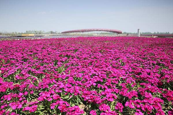 公園內(nèi)的“衲田花海”,總面積2220畝,由612塊花田 “縫補”拼接而成,融合了北方旱梯田的雄渾和南方水梯田的俊秀,與僧人袈裟異曲同工,又兼具納祥聚福之意,樸質(zhì)卻熠熠生輝。這里栽植著50多種花卉,自南向北形成黃、紅、紫三大色區(qū),呈現(xiàn)出海納百川之態(tài)、兼容并蓄之美。站在全長2.3公里的彩虹橋俯瞰花海,聽花開花落,嗅濃郁芬芳,感受濃濃的原鄉(xiāng)情懷。