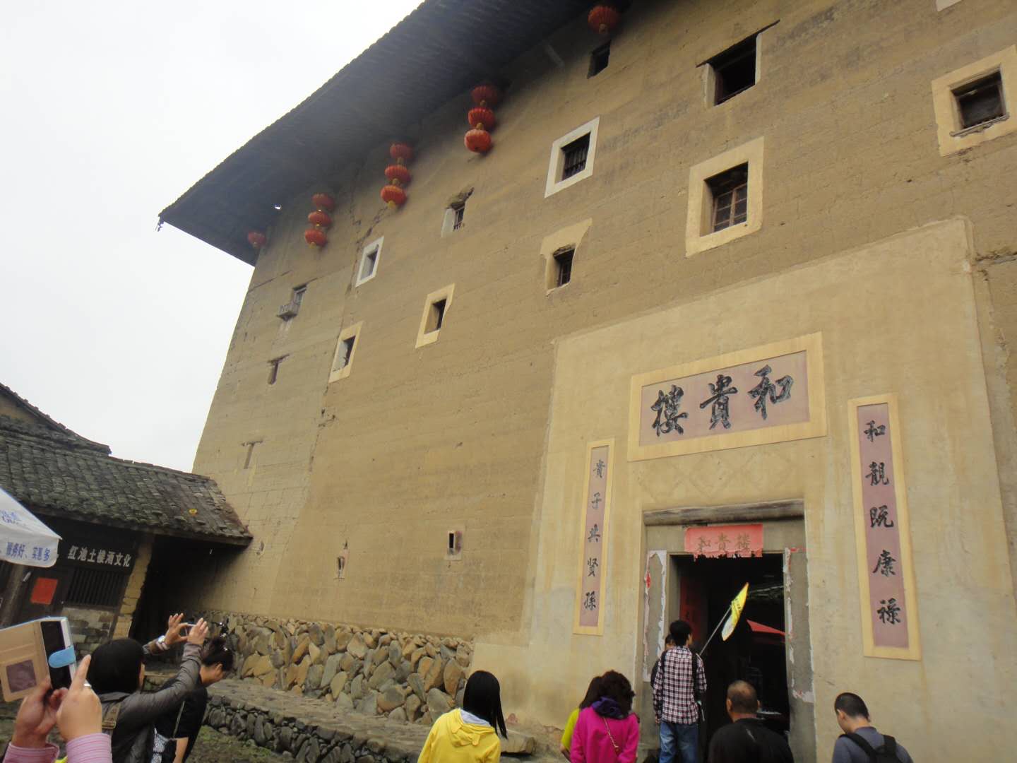 和貴樓每層有28個(gè)房間,共有140個(gè)房間。樓正中開(kāi)一個(gè)大門,東西南北四方各有樓梯上下。它建于清雍正十年(1732年),據(jù)說(shuō)當(dāng)初選址建樓,開(kāi)始并未發(fā)現(xiàn)這是塊沼澤地,樓建了一層,忽然整層樓像沉船一樣,慢慢下沉到了爛地里,建樓的簡(jiǎn)姓族人無(wú)可奈何,只好在下沉的樓墻上打了100多立方米的排樁,他們覺(jué)得地基這下牢固了,就從頭開(kāi)始夯墻,建起了一座五層高的方樓。他們似乎很有把握,從不擔(dān)心大樓會(huì)傾斜或者下沉,果然兩百多年來(lái),和貴樓固若金湯,風(fēng)雨不動(dòng)安如山。現(xiàn)在,你在樓中學(xué)堂的小天井用鐵線往地