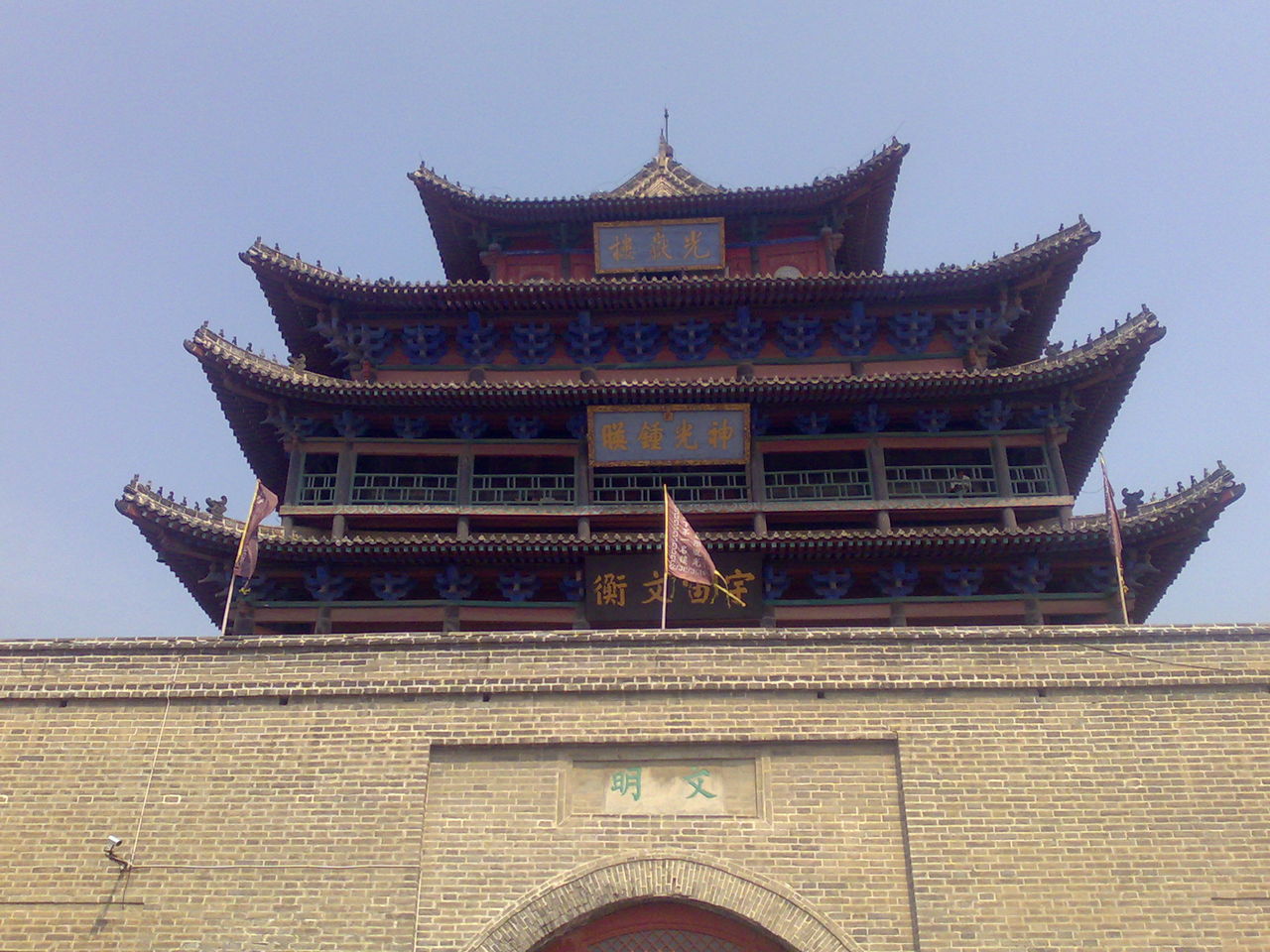 東、西、南面的詞都比較祥和,唯有北面是“武定”,這是由光岳樓的建造背景所決定的。東昌古城四門皆有四匾,東曰:“春熙”,西曰“清遠(yuǎn)”,南曰“正德”,北曰“宣威”,對(duì)北方都充滿了敵對(duì)的信息。