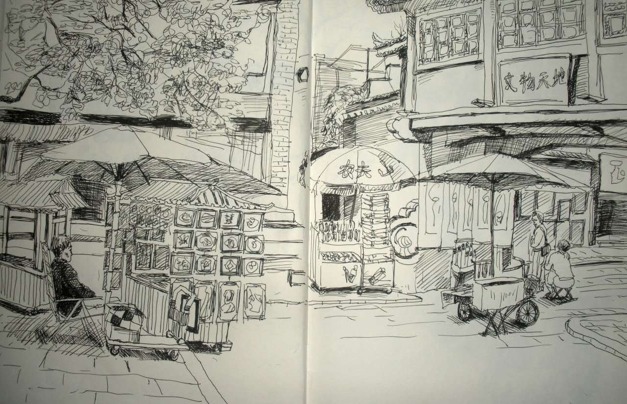 從南大街走到這條街上,忽然好像一下子安靜了下來。路兩邊,高大的槐樹后面,紅漆格子門半開著,大大小小的湖筆從門檐上面垂下來,后面是一張怡然自得的臉,表情似曾相識(shí)。青石板的路面緊貼著鞋底,松動(dòng)的地方發(fā)出清脆的烏烏聲。潑墨山水掛在城墻的青磚墻上,斑駁的陽(yáng)光灑在上面,隨風(fēng)輕輕抖動(dòng)。