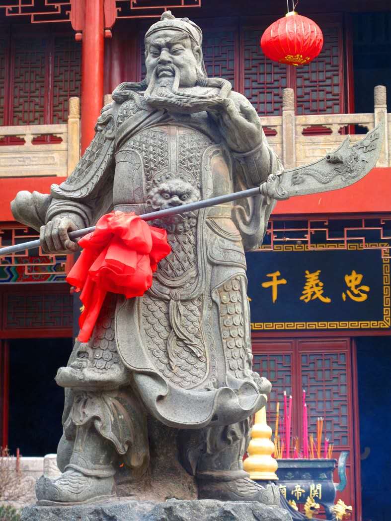 9、廣場(chǎng)關(guān)公立姿石像 誠(chéng)信殿旁,花崗巖雕塑的關(guān)公立姿像,高4.8米,關(guān)公面朝東方,握刀遠(yuǎn)眺,威儀凜然,似乎在訴說(shuō)“我回來(lái)了”!