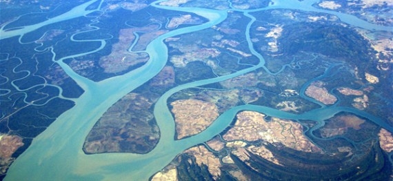 苗旺以南48公里的娘交附近,伊洛瓦底江開始分流,散作傘形分成多條支流流入安達曼海,形成河道交織如網(wǎng)的著名伊洛瓦底江三角洲。三角洲,西從勃生河口東至仰光河口,寬約242公里,南北長約90公里,面積3萬多平方公里。三角洲地區(qū)除一些高地外,概為現(xiàn)代沖積平原。地勢低下平坦,一般與海潮線相等,部分則在海潮線之下。由于每年有約3億噸的泥沙傾瀉海內(nèi),所以三角洲向外伸延的速度是驚人的,據(jù)測量,平均每年向海洋擴展66米左右。