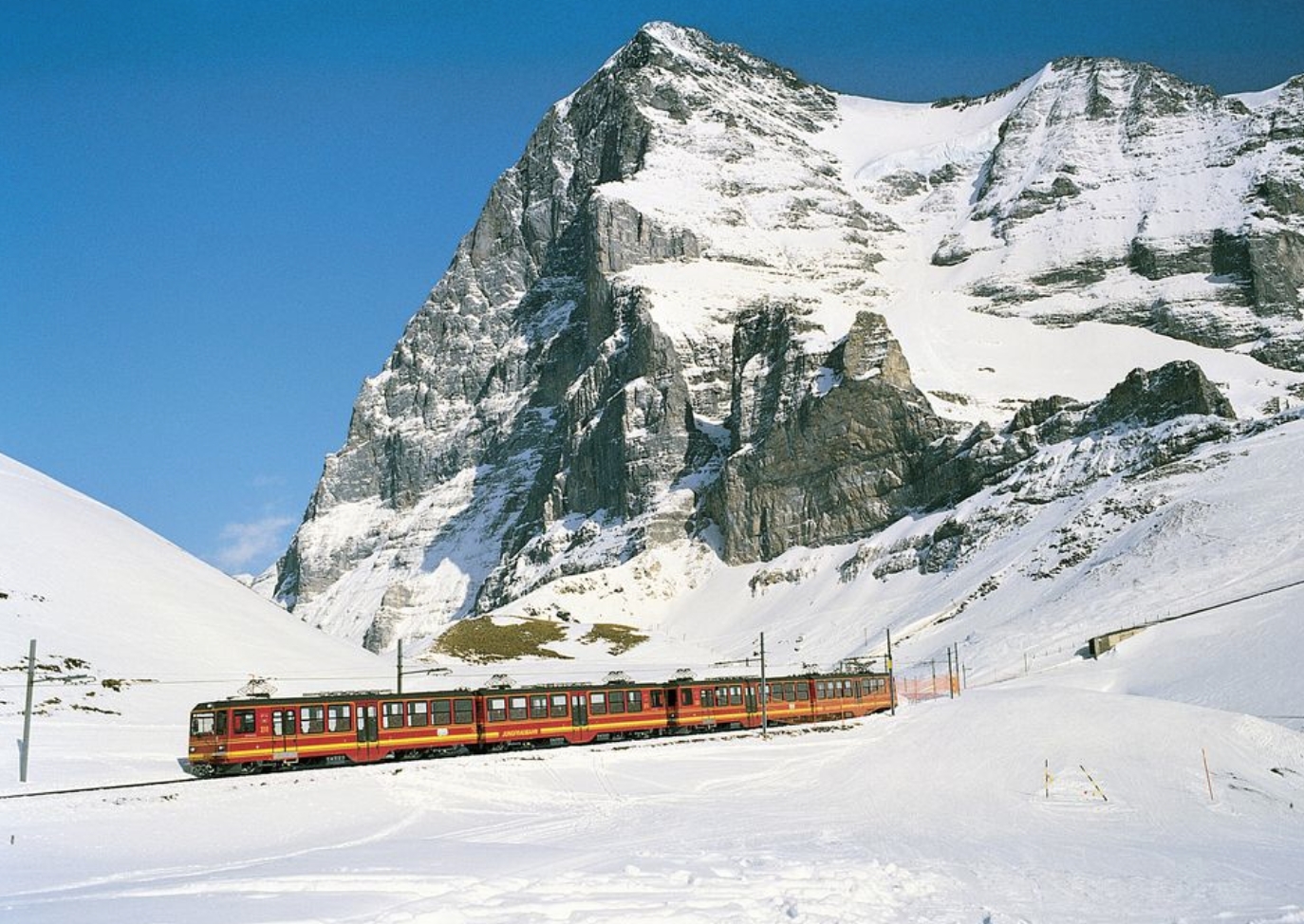 少女峰于1811年才首次由Meyer 兄弟征服。20世紀(jì)初少女峰鐵路(Jungfraubahn)建成,用隧道及齒軌鐵路連接少女峰旁,3,454米(11,333呎)高的小少女峰(Jungfraujoch)。位于小少女峰山內(nèi)的車站亦為歐洲最高的火車站,有“歐洲之巔”之稱。少女峰鐵路由山下Grindelwald 開始,婉延經(jīng)過Eiger 的草地,于Kleine Scheidegg 進(jìn)入隧道。于堅固的花崗巖內(nèi)的隧道雖然只長7 公里,坡度卻達(dá)到25%,于1898-1912年花了14年才完成,它有四分之三左右的路段是在冰河底下隧道巖壁里通過,工程十分艱巨。由Kleine Scheidegg 到少女峰車站,上山需時約50分鐘,下山則需要35分鐘。