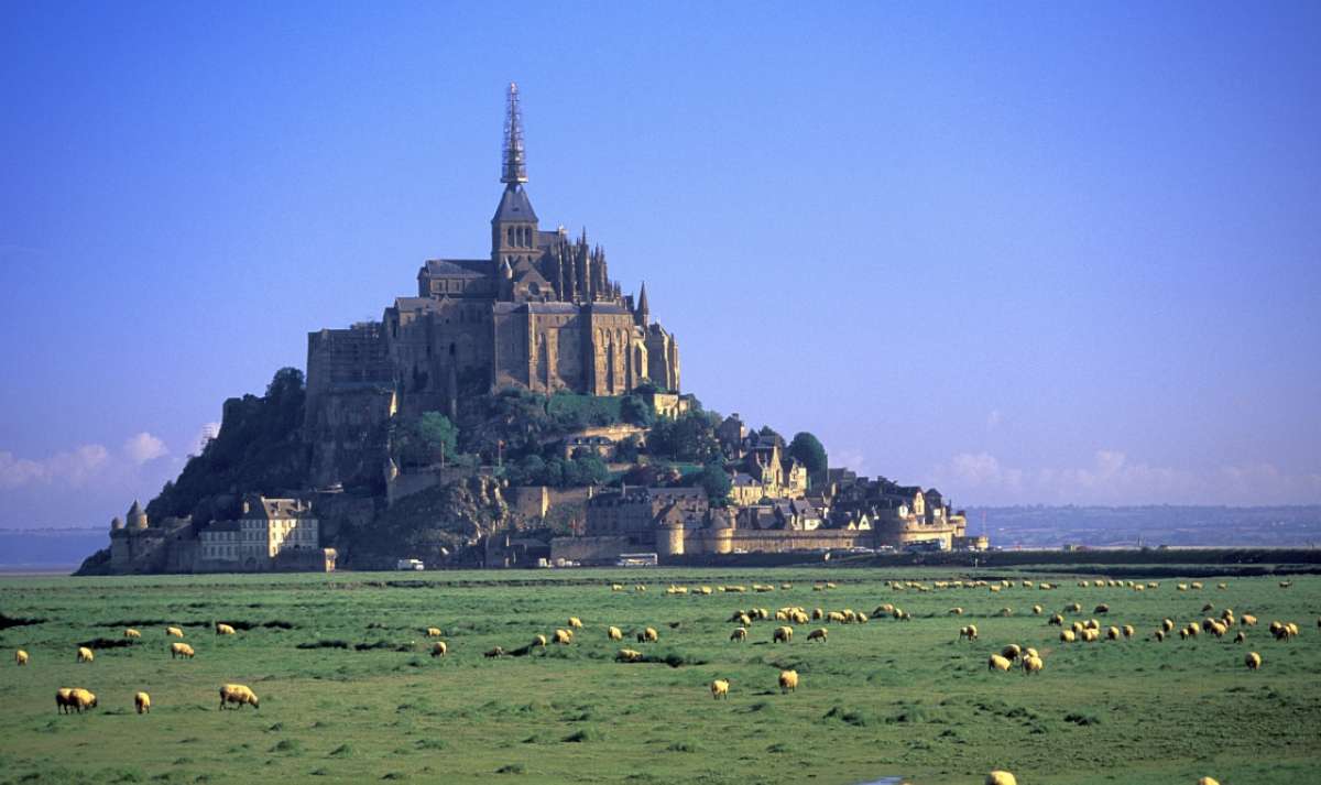 圣米歇爾山,法國(guó)著名古跡和基督教圣地,位于芒什省一小島上,距海岸兩公里。