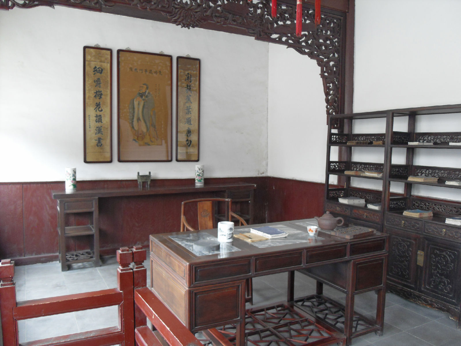 整個(gè)石家大院,60米長(zhǎng)的大甬道的兩側(cè)共有四合套式12個(gè)院落,所有院落都是正偏布局,四合套成,院中有院,院中跨院,院中套院;從寢室、客廳、花廳、戲樓、佛堂到馬廄,無(wú)論是通體歌劇、建筑風(fēng)格、還是藝術(shù)裝飾,都反映了清末民初的文化遺存和當(dāng)時(shí)的民俗民風(fēng)。現(xiàn)辟為楊柳青民俗博物館。跨進(jìn)石家大院大門(mén),首先映入眼簾的是一條大青方磚鋪就的長(zhǎng)甬道。 甬道的東側(cè),原是石氏家族的起居寢室,現(xiàn)在是展品陳列區(qū),陳列了楊柳青木版年畫(huà)的歷代杰作和磚雕藝術(shù)品。甬道西側(cè),主要有花廳、戲樓、佛堂等建筑,是石氏家族會(huì)晤賓朋、娛樂(lè)消閑、誦經(jīng)禮佛的場(chǎng)所,現(xiàn)辟為博物館的“石府復(fù)原陳列區(qū)”。