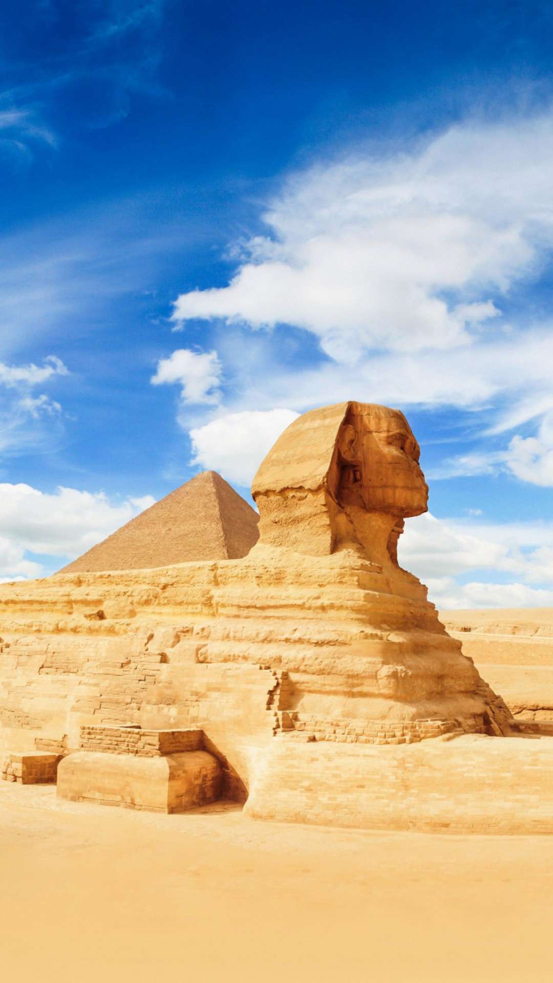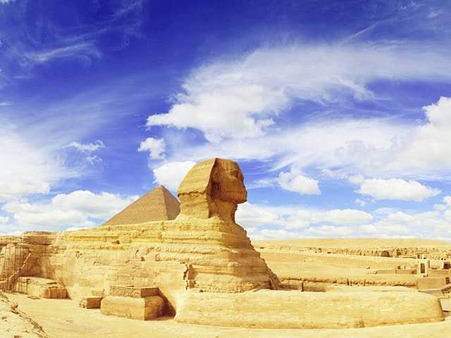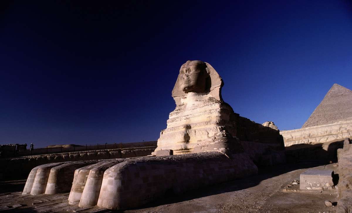 獅身人面像(又譯“斯芬克斯” sphinx)坐落在開羅西南的吉薩大金字塔近旁,是埃及著名古跡,與金字塔同為古埃及文明最有代表性的遺跡。像高21米,長57米,耳朵就有2米長。除了前伸達(dá)15米的獅爪是用大石塊鑲砌外,整座像是在一塊含有貝殼之類雜質(zhì)的巨石上雕成。面部是古埃及第四王朝法老(即國王)哈夫拉的臉型。相傳公元前 2611年,哈夫拉到此巡視自己的陵墓——哈夫拉金字塔工程時(shí),吩咐為自己雕鑿石像。工匠別出心裁地雕鑿了一頭獅身,而以這位法老的面像作為獅子的頭。在古埃及,獅子是力量的象征,獅身人面像實(shí)際上是古埃及法老的寫照。雕像坐西向東,蹲伏在哈夫拉的陵墓旁。由于它狀如希臘神話中的人面怪物斯芬克斯,西方人因此以“斯芬克斯”稱呼它。