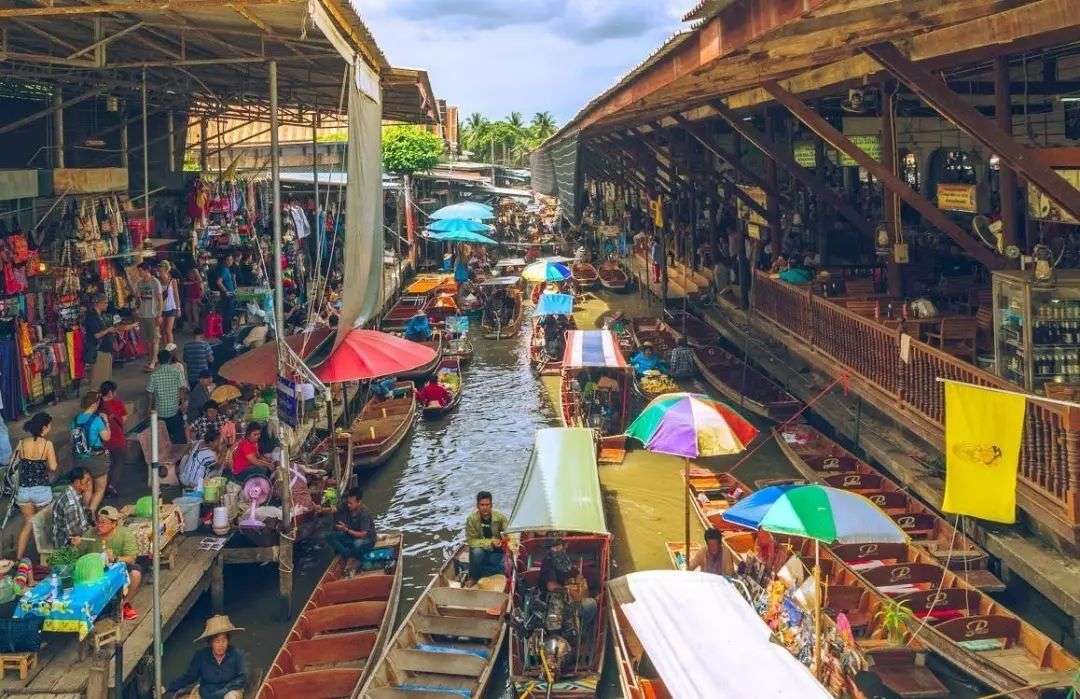 在泰文的意思是『賓至如歸』,當(dāng)年的泰皇拉瑪五世微服出巡到此,不知情的村長一樣熱情的款待,讓五世皇深受感動,于是便以Damnnoen Saduak命名,也為水上市場帶來了百年的豐盈。