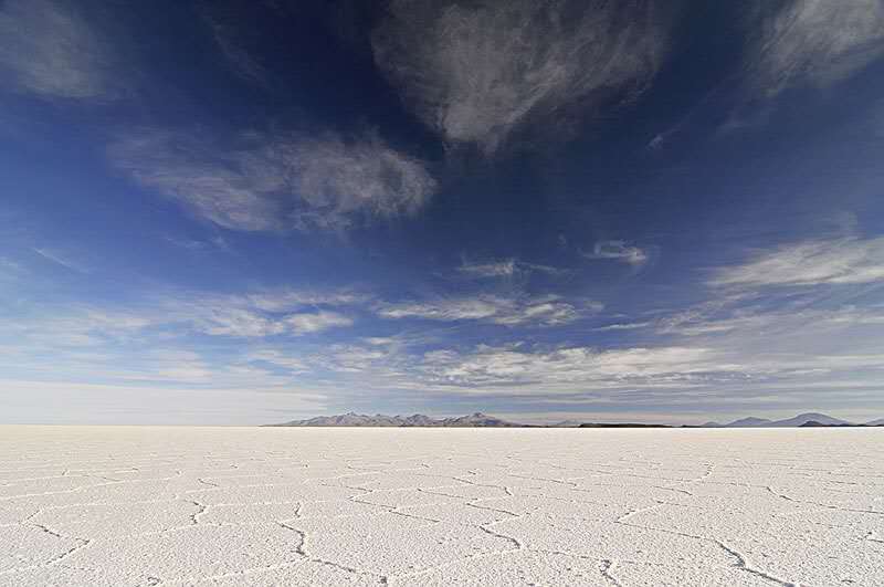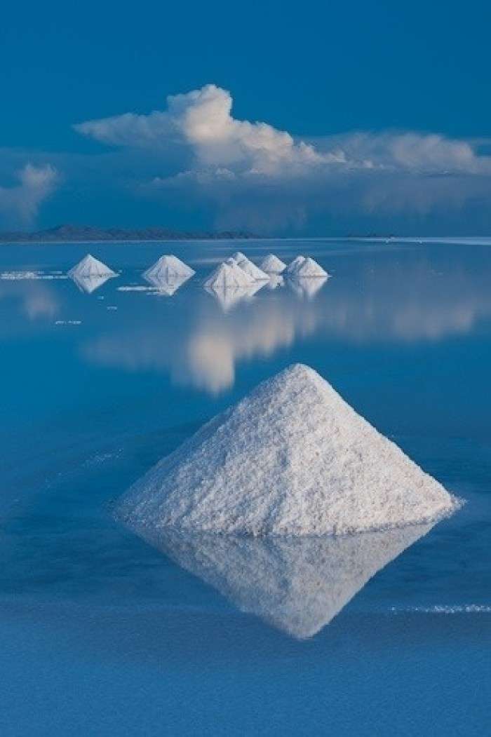 在高原南端有一些冰川融化時留下的鹽湖,而在1萬年前最后一個冰期(第四紀冰期)結(jié)束時,湖水已逐漸消失。高原上最大并最令人印象深刻的就是烏尤尼鹽沼(Salar de Uyuni)。每年夏季(雨季12月至次年1月),它被雨水注滿,形成一個淺湖;而每年冬季(旱季7月至10月),湖水則干涸,留下一層以鹽為主的礦物質(zhì)硬殼,中部達6米厚。人們可以駕車駛過湖面。尤其是在雨后,湖面像鏡子一樣,反射著好似不是地球上的、美麗的令人窒息的天空景色,這也就是傳說中的“天空之鏡”。由于面積空曠,極其光滑(覆蓋著淺水),同時又極平整(海拔差異極小),地表反射率極高,使阿塔卡瑪成為一個理想的測試和校準地球遙感衛(wèi)星之地。