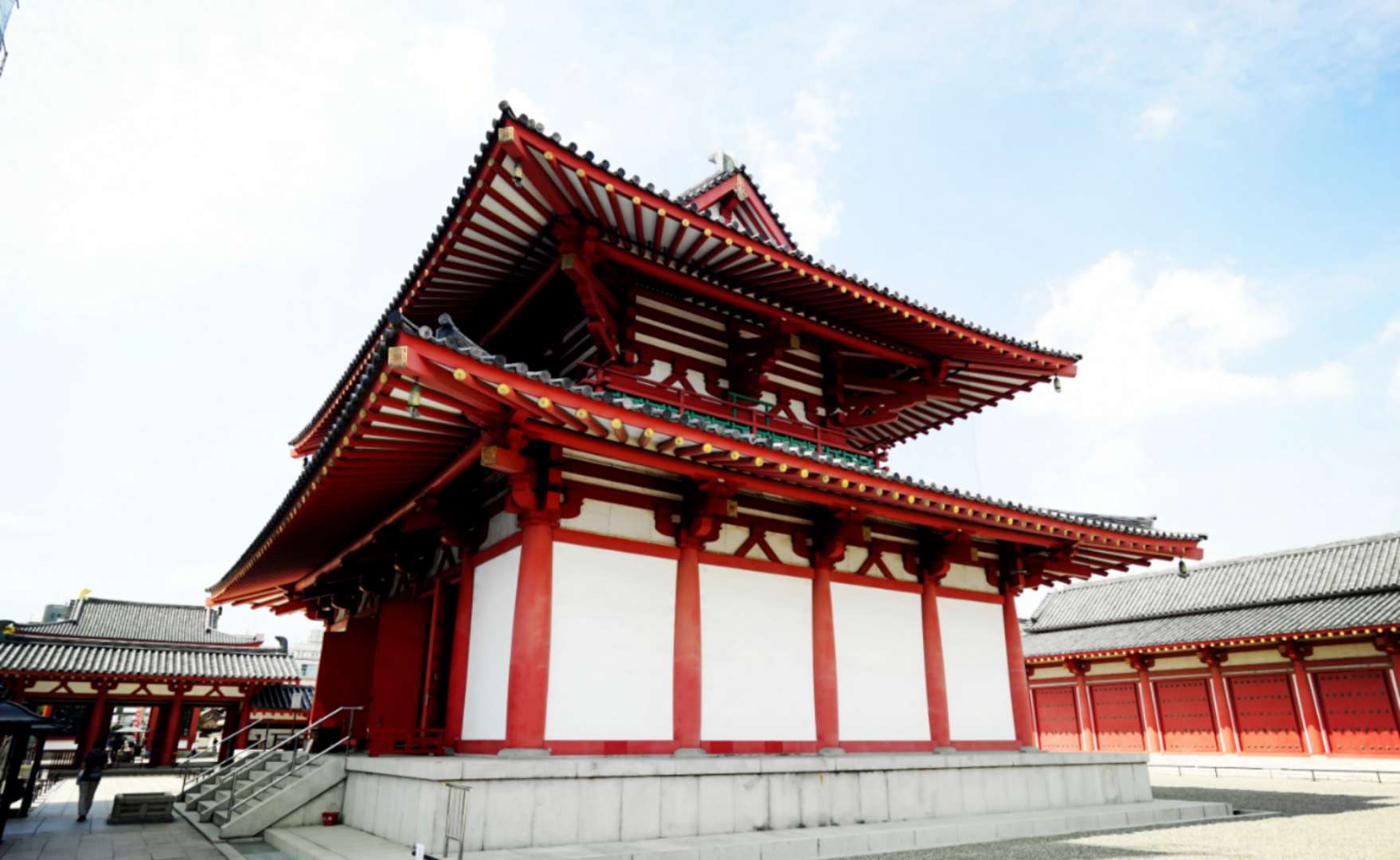 據(jù)《日本書紀(jì)》記載,信奉佛教的圣德太子與反佛教的物部守屋一派開戰(zhàn)前,形勢(shì)不利的圣德太子曾向法神四天王像許愿,打敗物部派后將為四天王建立寺院。公元593年,戰(zhàn)勝的圣德太子在大阪建立了四天王寺,這是日本飛鳥時(shí)代的代表性寺院建筑。