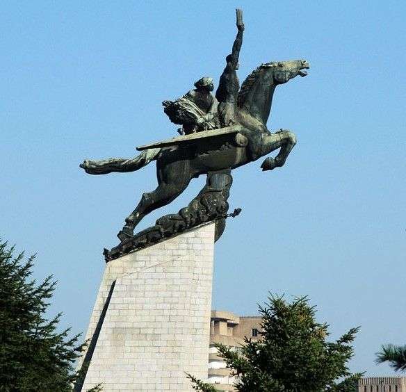 朝鮮千里馬銅像矗立在萬壽臺的丘崗上,是1961年4月 15日,在偉大領(lǐng)袖金日成同志的49壽辰之際建立的。座基是用360多種2,500多塊不同規(guī)格的花崗巖壘起來的,銅像為一匹伸展雙翅的騎有工人、農(nóng)民的 “千里馬”。