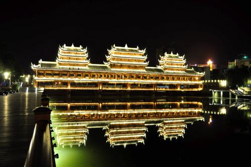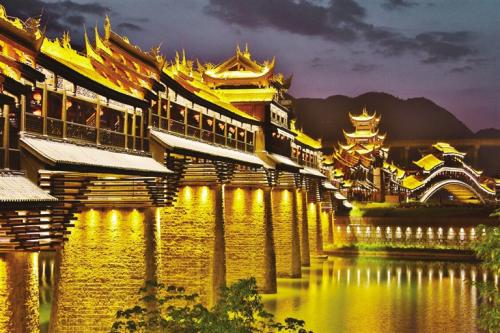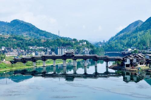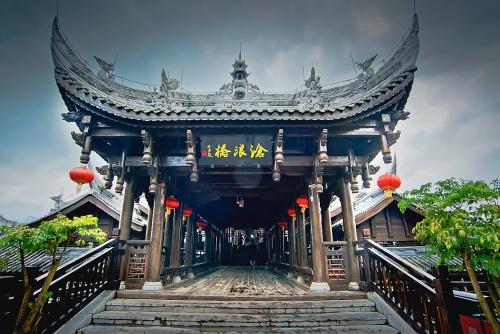 黔江濯水古鎮(zhèn)風(fēng)雨橋橫跨于阿蓬江上,長303米、寬5米,據(jù)說是亞洲最長的廊橋,分為橋、塔、亭三部分。濯水古鎮(zhèn)風(fēng)雨橋橋身為純木制結(jié)構(gòu),建筑材料之間以榫頭卯眼互相穿插銜接,直套斜穿,結(jié)構(gòu)牢固精密。橋建有三層塔亭,兩側(cè)有約百扇可自由開合的雕花木窗,橋內(nèi)擺放有紅漆長凳。