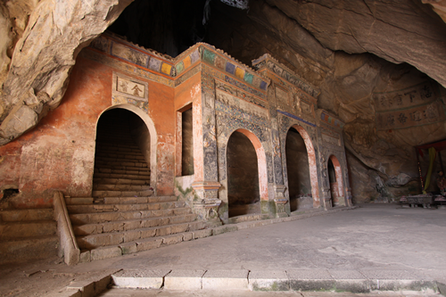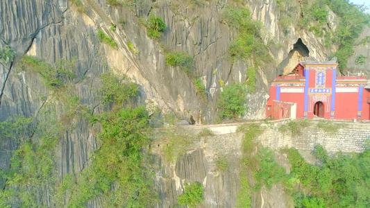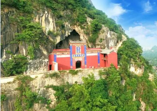 是當年蘇元春將息之所。依洞設(shè)景,別有天地。宮門進處,洞廳暢明,石刻滿壁。“古洞長春”其左,“奠麗南邦”其右,書藝精湛,分外醒目。左洞上去,是一道朱門,雕龍刻鳳,氣宇軒昂。額題:“玉闕”。對開耳門,號曰“金階”。巨幅壁刻云,“遙通帝座”。沿“金階”上去,見一座金門,稱為“天闕”。左設(shè)左禁門,右置右禁門。洞府正中,一把巨大的石傘之下,數(shù)株石筍,宛若數(shù)名仙女,簇擁“天帝”。回首身后,一道強光從高遠之處,穿山而下,那湛藍的天穹,恰似一面奪目的寶鏡,陽光就從那里直照到"天帝"的寶座之前。真是奇光天外來,滿洞放異彩。從宮右往“天橋”走去,爬到高遠的洞口,回身展望,又看到一道彩墻,圖案精美,玲瑰透剔,額題“萬物資始”。自此俯瞰山下,清溪如帶,田垌鋪金,村落點點。“保元宮”,結(jié)構(gòu)精美,金門重疊,朱戶畫墻,多彩多姿,真是富麗堂皇,勝似蓬萊。洞頂題詩云,“蜿蜒步上九重天,回首山河數(shù)點煙。如今方識保元妙,幾回夢魂到小連”。美妙的“保元宮”,確令游客駐足留連。