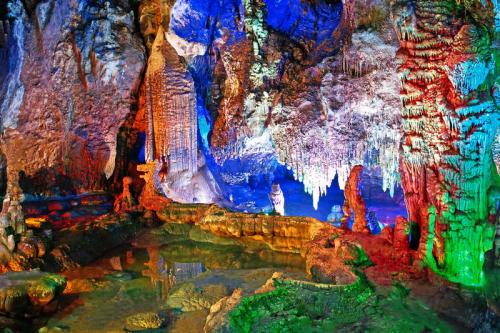 龍宮仙境”是一個鐘乳石正在不斷生長發(fā)育著的溶洞,洞內(nèi)的滴水活動非常活躍且洞內(nèi)的鐘乳石非常密集,有很多分布在游步道兩側(cè)。由隧道、前廳、金龍迎賓廳、龍宮寶藏廳、龍宮仙境廳、龍母后宮和仙人遺址等七部份組成。