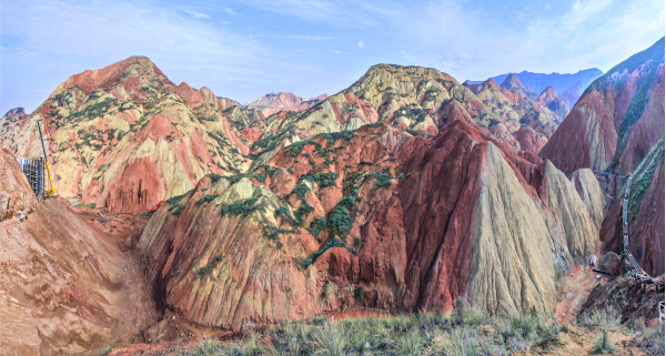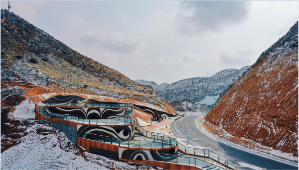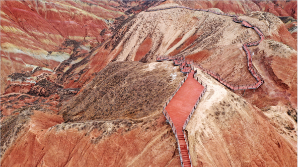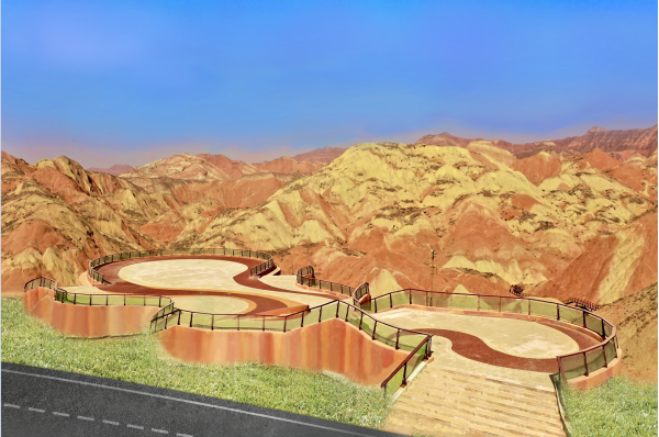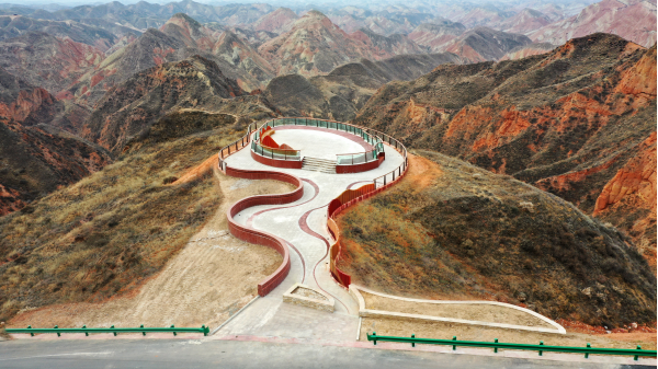 九色丹青觀景平臺(tái)九色丹青觀景平臺(tái)海拔1748米,平臺(tái)的造型宛若一把琵琶橫鋪在丹霞崖壁之間,遠(yuǎn)遠(yuǎn)望去,渾然天成。這里彩色的千巖萬(wàn)壑仿佛觸手可及 ,色彩斑斕的丘陵仿似上帝的調(diào)色板,富含石青、石綠、朱砂、白堊、黃赭石等三十余種礦物質(zhì)的巖石在陽(yáng)光的照射下,各種色彩濃烈地交織在一起,色調(diào)或如波浪順著山勢(shì)起伏,或從山頂傾瀉而下,山形肌理狀若潑墨山水,美不勝收。