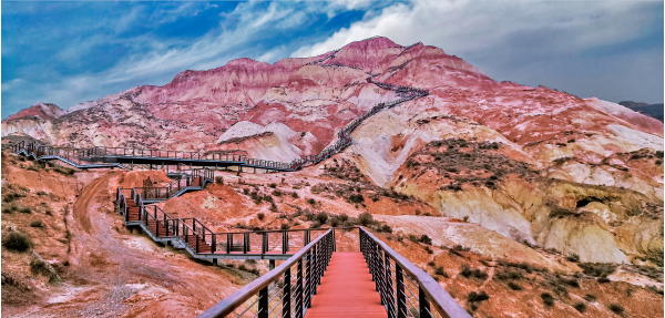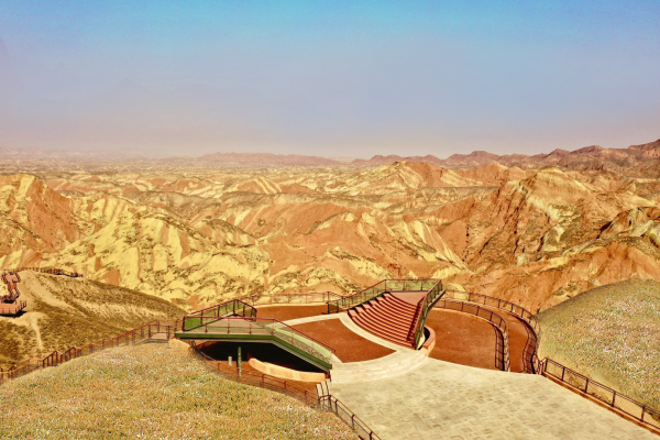 丹頂攬勝觀景平臺(tái)丹頂攬勝觀景平臺(tái)海拔1959米,是整個(gè)景區(qū)的最高點(diǎn)。在這里,可俯瞰景區(qū)內(nèi)綿延分布的彩色丘陵,似與天際線融為一體,勝似彩虹垂天。 彩丘、崖壁,幽谷、崖麓盡收眼底,連綿起伏的山巒宛如緋紅色的大海波濤,色彩斑斕的丘陵如同大海中忽隱忽現(xiàn)的島礁,甚為壯觀。山谷中不時(shí)升起的氤氳霧氣,仿似瑤池仙境,令人心曠神怡。
