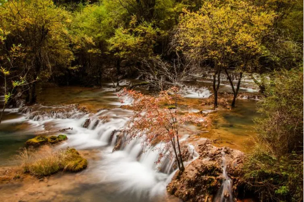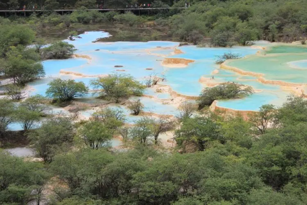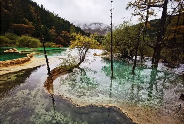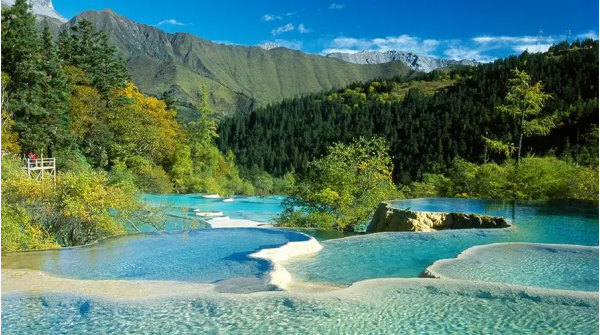 黃龍溝因流水中鈣化沉淀堆積,形成了3400余個鈣化彩池,8萬平方米的鈣化流灘,5個巖溶瀑布,4個溶洞。在黃龍五彩池長3.5公里,寬1~2公里的黃龍溝內,面對玉翠山,四周原始森林密布,鈣化翠池、金色流灘,似一條黃色巨龍俯臥于密林之中。池水清澈透明,在日光照射下,五彩繽紛。人行其間,似入畫中,被譽為“人間瑤池”。
