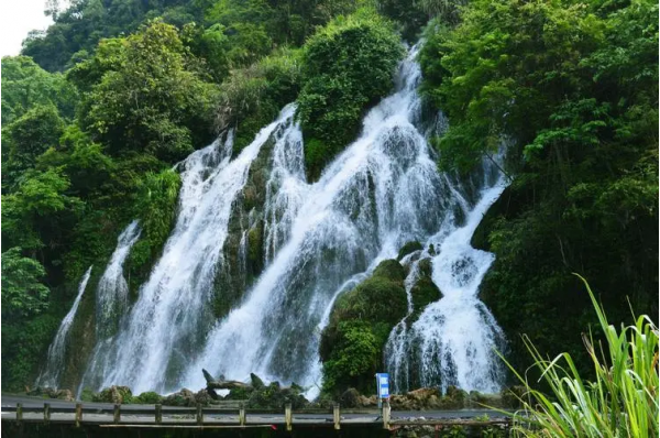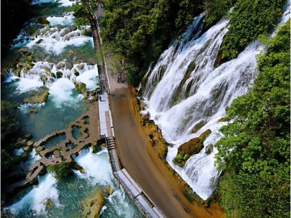 拉雅瀑布騰空噴瀉,橫向墜落,同響水河縱向錯落的68級瀑布構(gòu)成一幅絕妙的立體交叉瀑布群景觀。瀑在路側(cè),人在瀑下,倍覺酣暢和親爽。