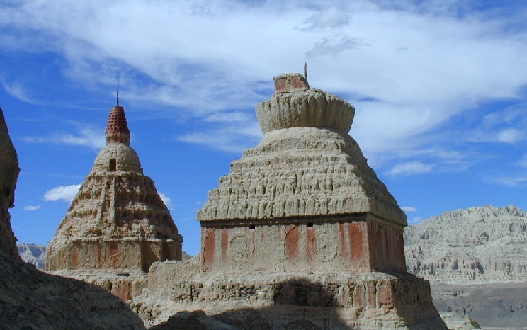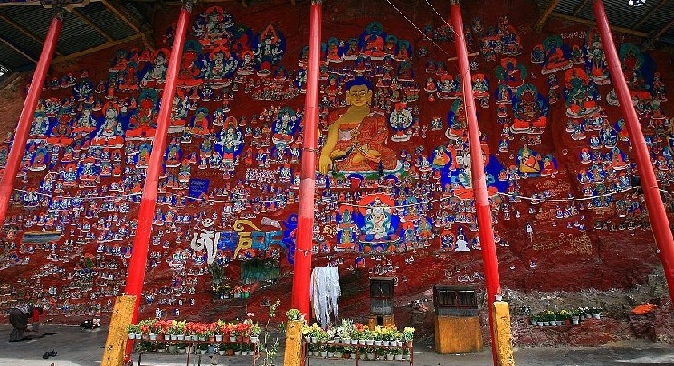 藥王山東側有個洞窟式的小廟宇,是一座造型奇特的石窟寺廟,坐落在藥王山東麓陡峭的山腰上,叫查拉魯普。經(jīng)過一千多年的風風雨雨,中間幾經(jīng)興衰,這座拉薩地區(qū)罕見的石窟寺廟至今仍然保存完好。石窟呈不規(guī)則長方形,面積約27平方米,洞口有一中心柱,中心柱與洞壁之間是狹窄的轉經(jīng)廊道,巖壁上有69尊石刻造像,66道兩邊排列石刻神像,北面石壁上有松贊干布與文成公主、尺尊公主以及重臣吞米桑布扎、祿東贊的造像。洞內(nèi)光線暗淡,全靠酥油供燈照明。如果去看,千萬別忘了要帶頭燈。