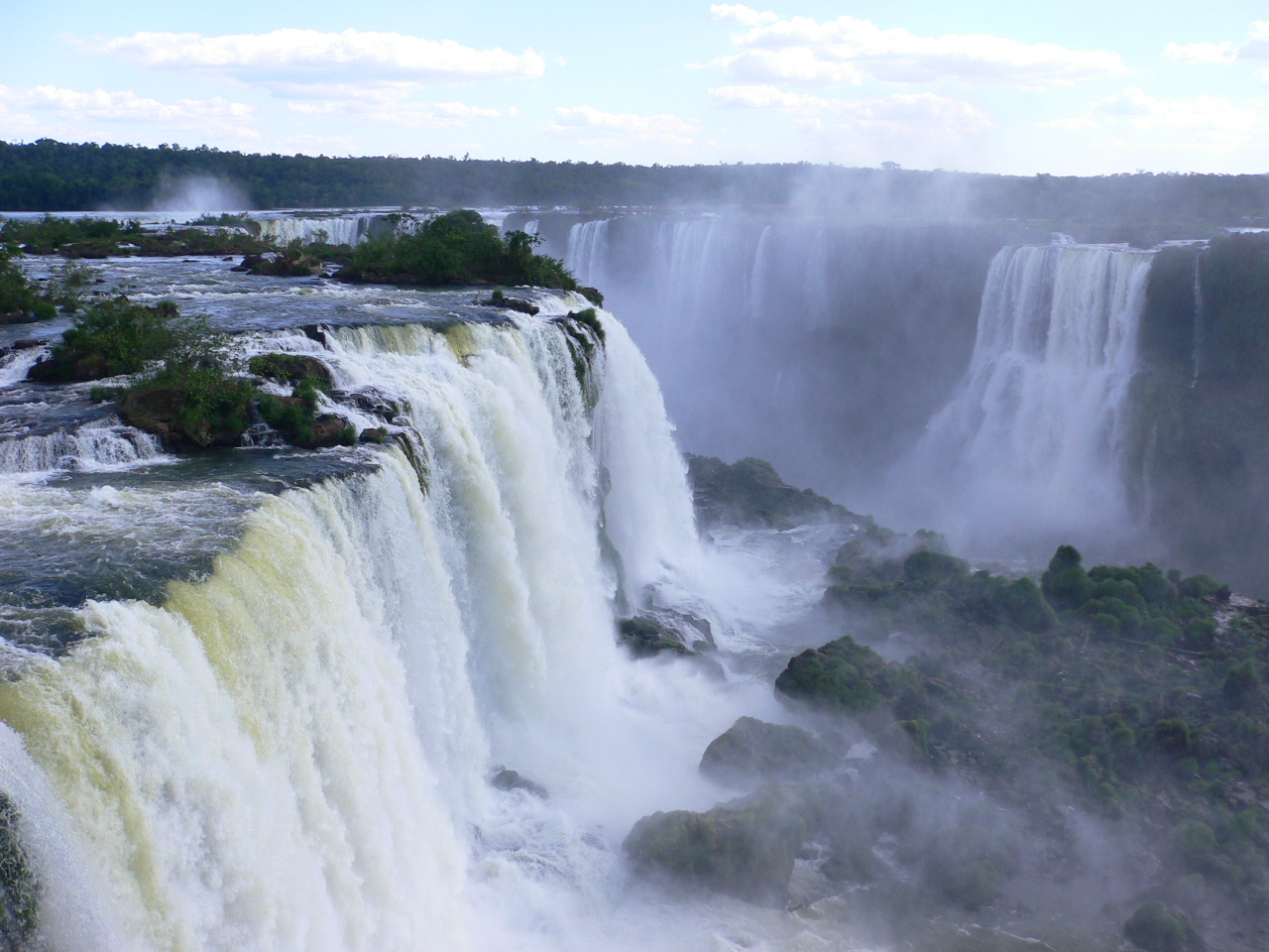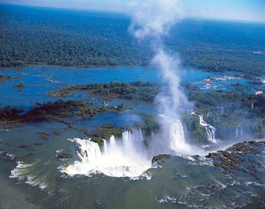 伊瓜蘇大瀑布,亦作Iguassu或Iguazu,西班牙語作Cataratas del Iguazu,葡萄牙語作Cataratas do Iguaçu或Saltos do Iguaçu,平均流量1,751立方米/秒,為馬蹄形瀑布,高82米(269呎),寬4公里(2.5哩),是北美洲尼加拉瀑布寬度的4倍,比非洲的維多利亞瀑布大一些。懸崖邊有無數(shù)樹木叢生的巖石島嶼,使伊瓜蘇河由此跌落時約分為275股急流或瀉瀑,高度60~82公尺(200~269呎)不等。該瀑布與伊瓜蘇河皆得名于一個意為「大水」的瓜拉尼語(Guarani) 詞匯。流入伊瓜蘇河。