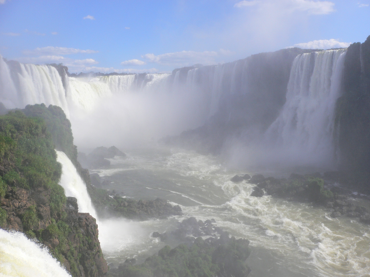 “伊瓜蘇”在南美洲土著居民瓜拉尼人的語言中,是“大水”的意思。發(fā)源于巴西境內(nèi)的伊瓜蘇河在匯入巴拉那河之前,水流漸緩,在阿根廷與巴西邊境,河寬1500米,像一個湖泊。水往前流陡然遇到一個峽谷,河水順著倒U形峽谷的頂部和兩邊向下直瀉,凸出的巖石將奔騰而下的河水切割成大大小小270多個瀑布,形成一個景象壯觀的半環(huán)形瀑布群,總寬度3000米至4000米,平均落差80米。