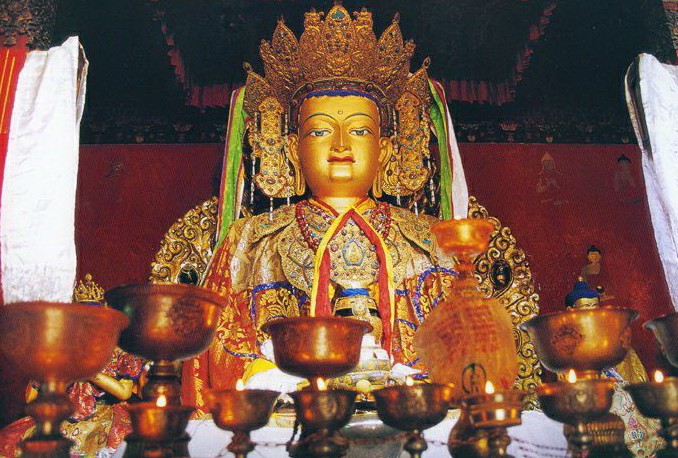 根據(jù)五世達(dá)賴?yán)锼摹洞笳阉履夸洝返葧?shū)記載:小昭寺主神殿原來(lái)主供文成公主從長(zhǎng)安帶來(lái)的釋迦牟尼12歲等身像,大昭寺主神殿原來(lái)主供尼泊爾的尺尊公主從加德滿都帶來(lái)的釋迦牟尼8歲等身像。松贊干布逝世后,遵照文成公主的旨意,大昭寺和小昭寺釋迦牟尼等身佛像進(jìn)行了對(duì)換。