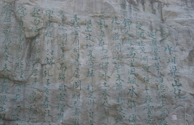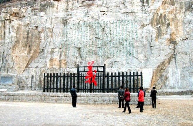 《水泊梁山記》是著名書畫大師范曾2002年專為水泊梁山風景區(qū)撰寫。先生懷著對英雄故里的一腔深情,慷慨揮毫、步其先人范仲淹《岳陽樓記》韻,全文368字,描述了水泊梁山河岳闊峻、草木蕭森的雄奇景象。《水泊梁山記》大型摩崖石刻,通高7米、長14米,距地面10余米,單字最大55厘米見方,最小字30厘米見方,通篇368字占地近100平方米,氣勢恢弘、蔚為大觀,形成了南有《岳陽樓記》、北有《水泊梁山記》的文化格局。為旅游勝地水泊梁山再添景觀,現為水泊梁山風景區(qū)的主要景點之一。與梁山粗獷豪放的山體及周圍環(huán)境交融,深化了景區(qū)的水滸文化內涵,成為進入梁山風景區(qū)山寨景區(qū)的標志性景觀,其所在廣場,亦成為在梁山舉行的與水滸、旅游有關的大型集會的場所之一。