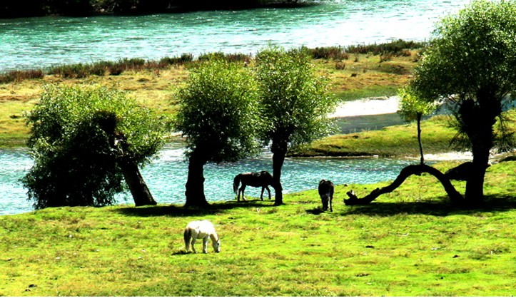 尼洋河在源頭是一條細流,它奔流向前,越流越急。它要沖破各種阻力和障礙,不急不行。到了中游以下,河面已越流越寬,水流也漸漸平緩了下來。這時的尼洋河已漸入佳境,河水中,可以看到對岸青山綠樹的清晰倒影了。天上的白云也到尼洋河里來游蕩,它們在河里弄濕了衣衫,一件一件都掛到天上去晾曬。這時想到一個詞:行云流水。這是一種難以言語的美妙境界,創(chuàng)造這個美妙詞匯的人,當他獲得靈感的那一刻,我想他的心靈肯定已和大自然的美景融為一體了。