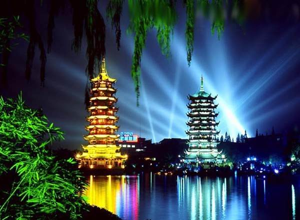 桂林日月雙塔號(hào)稱(chēng)世界第一銅塔,是桂林旅游的一個(gè)絕美夜景觀(guān)賞地。地處桂林市中心區(qū),座落在桂林城的中軸線(xiàn)上,與“象山水月”相鄰。象山是桂林的城徽,而雙塔則是新桂林的標(biāo)識(shí)。其中日塔高41米共九層,通體均為純銅裝飾,耗用銅材350噸,金碧輝煌,并有電梯供游客觀(guān)光乘坐。銅塔所有構(gòu)件如塔什、瓦面、翹角、斗拱、雀替、門(mén)窗、柱梁、天面、地面完全由銅壁畫(huà)裝飾,整座銅塔創(chuàng)下了三項(xiàng)世界之最——世界上最高的銅塔,世界上最高的銅質(zhì)建筑物,世界上最高的水中塔。 月塔高35米共七層,為琉璃塔。每層的雕花彩繪門(mén)窗寓意不同的主題,富含中國(guó)傳統(tǒng)韻味,通過(guò)水下18米長(zhǎng)的水族館與日塔連接,其地宮之中有桂林明代青花梅瓶大型壁畫(huà)。杉湖日月雙塔已成為觀(guān)賞桂林城市精華美景的勝地。