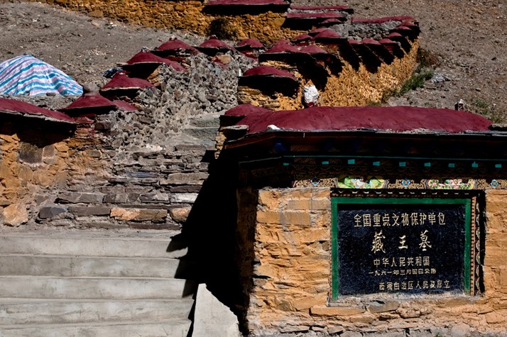 藏王墓屬全國(guó)重點(diǎn)文物保護(hù)單位,位于山南窮結(jié)縣宗山的西南方,背靠丕惹山(意為增長(zhǎng)之山),是吐蕃王朝時(shí)期第29代贊普至第40代(末代)贊普、大臣及王妃的墓葬群,總面積385平方米。各陵墓封土高大,為土壘成的高臺(tái)丘墓。其上層土墩為橢圓形,墩頂極平坦,東西長(zhǎng)約130米;下層為長(zhǎng)方形土臺(tái),周邊不齊整。藏王墓的數(shù)目現(xiàn)難確定,能看到的有八九座。