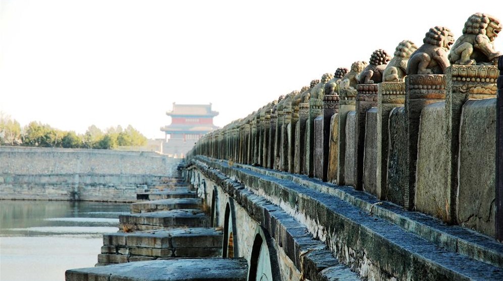 盧溝橋(Lugou Bridge)亦作蘆溝橋,在北京市西南約15千米處豐臺(tái)區(qū)永定河上。因橫跨盧溝河(即永定河)而得名,是北京市現(xiàn)存最古老的石造聯(lián)拱橋。盧溝橋全長266.5米,寬7.5米,最寬處可達(dá)9.3米。有橋墩十座,共11個(gè)橋孔,整個(gè)橋身都是石體結(jié)構(gòu),關(guān)鍵部位均有銀錠鐵榫連接,為華北最長的古代石橋。