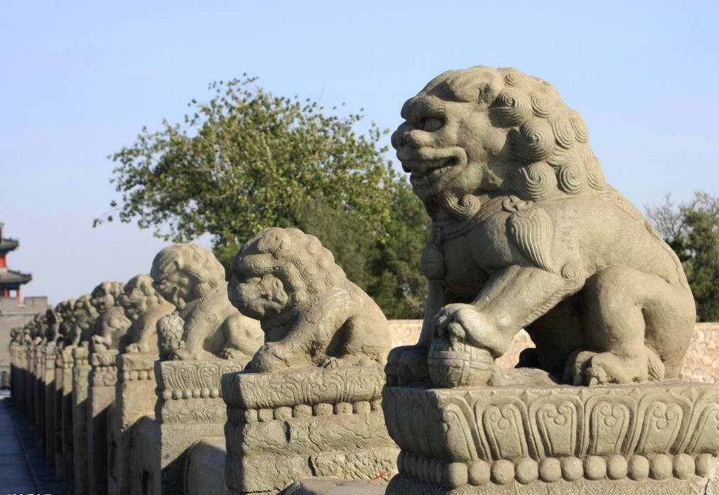 盧溝橋始建于1189年六月,明昌三年(1192年)三月完工。兩側(cè)石雕護(hù)欄各有140條望柱,柱頭上均雕有石獅,形態(tài)各異,據(jù)記載原有627個(gè),現(xiàn)存501個(gè)。石獅多為明清之物,也有少量的金元遺存。“盧溝曉月”從金章宗年間就被列為"燕京八景"之一。