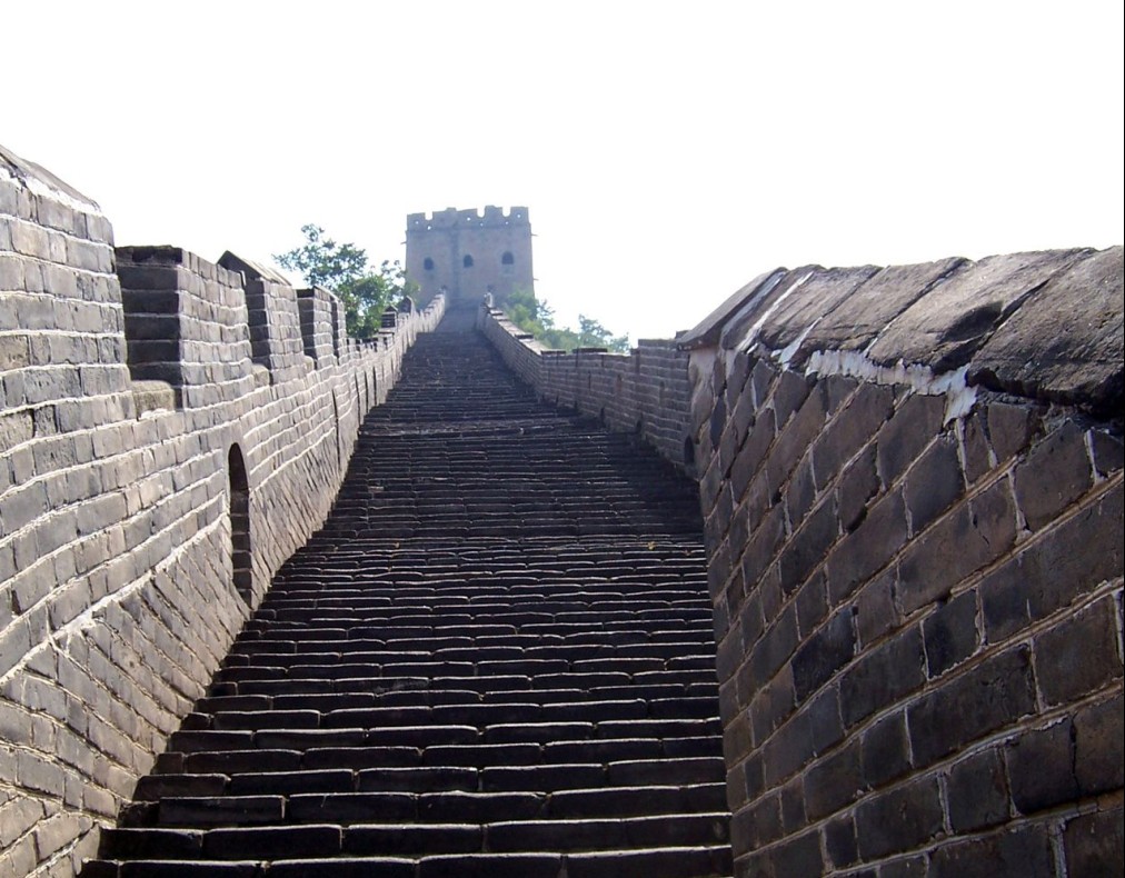 登上第六個敵樓,樓分上下兩層:上層是瞭望臺;下層是成邊將士住房,三面有窗,北邊是射箭孔。整個樓用大方石塊砌成,顯得墩實、堅固,氣度不凡長城的最高處為,需登“天梯”而上。天梯高達100米,坡度85度,幾近垂直,無膽量的絕難征服。仰頭上望,那磚石砌就的臺階僅可容腳,兩側(cè)懸崖陡壁,中間這一道臺階細如線,薄如刃,陡如立。