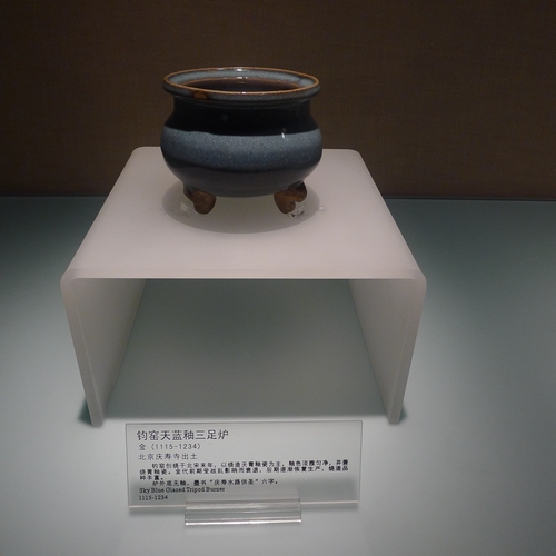 瓷器展廳中展出了北京作為都城歷史時期出土和傳世的瓷器170組件,青花釉里紅海水云龍紋天球瓶在2000年就已價值1000萬元。另外宋遼金時期的定窯白釉童子誦經(jīng)壺、元大都出土的青花鳳首扁壺、乾隆松石綠地粉彩蕃蓮紋多穆壺等名貴瓷器都是難得一見的稀世精品。展廳中還列有明成化斗彩葡萄紋杯,這對葡萄紋杯與雞缸杯為同時期作品,都是明代官窯的代表作,而雞缸杯只有一只,葡萄紋杯是一對,這對杯子是在清初重臣索尼7歲孫女的墓中出土的。