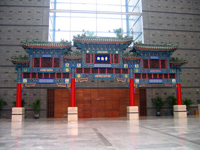 首都博物館建筑本身是一座融古典美和現(xiàn)代美于一體的建筑藝術品,既具有濃郁的民族特色,又呈現(xiàn)鮮明的現(xiàn)代感。巨大的屋蓋繼承了中國傳統(tǒng)建筑深遠挑檐;通長的石質(zhì)幕墻象征著中國古代城墻;版權(quán)所有山東聊城聊之旅國際旅行社有限公司,轉(zhuǎn)載必究!廣場起坡傳承古代高臺建筑風格;在大廳北門外地面上鑲嵌清代丹陛,大廳內(nèi)有明代牌樓,體現(xiàn)出中國傳統(tǒng)建筑平面中心軸線特點;橢圓形的青銅展館斜出墻面寓意古代文物破土而出。青銅、木材與磚石的大量運用更顯一種歷史的久遠。北廣場和大堂地面所用石材,產(chǎn)于自古以來為營造北京城供應石材的房山地區(qū);方形展廳的外裝飾,采用北京最常見的榆木;橢圓形展廳的外裝飾,采用青銅材料,并飾以北京出土的西周時期青銅器的紋樣。鋼結(jié)構(gòu)棚頂、玻璃幕墻等表現(xiàn)出北京有力的時代步伐,高大空間和通透的視覺效果順應了當代建筑的國際流行趨勢。