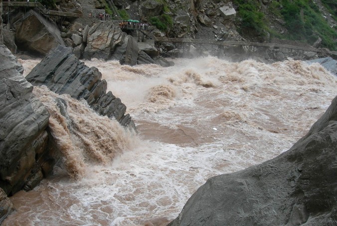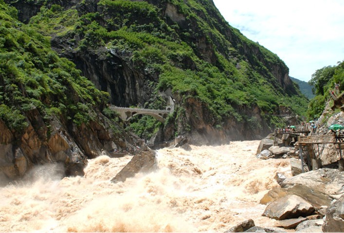 石鼓以下,江面漸窄,至左岸支流碩多崗河口橋頭鎮(zhèn),往東北不遠即進入舉世罕見的虎跳峽。虎跳峽上峽口與下峽口相距僅16公里,落差竟達220米。平均坡降達13.8‰,是金沙江落差最集中的河段。峽中水面寬處60米,窄處僅30米并有巨石兀立江中,相傳曾有猛虎在此躍江而過,故名虎跳石,虎跳峽也由此得名。峽內(nèi)急流飛瀉、驚濤轟鳴,最大流速達10米/秒。峽谷右岸為海拔5596米的玉龍雪山,左岸為海拔5396米的哈巴雪山,兩山終年積雪不化。峽內(nèi)江面不足海拔1800米,峰谷間高差達3000余米。峽中谷坡陡峭,懸崖壁立,呈幼年期“V”型峽谷地貌。