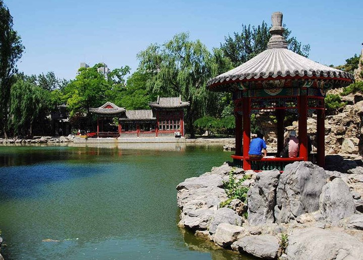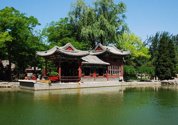 融合了江南庭院的湖光山色和古樸典雅的北方園林風(fēng)光。景區(qū)有近4700平方米的湖面。湖畔倚建古色古香的水榭、畫舫、小園亭,湖南北架以曲橋、拱橋。