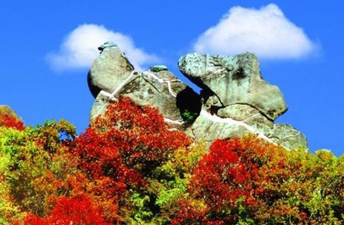 在白樺林附近,游路邊的山峰頂部,兩塊巨石狀如鴛鴦相依相偎。關(guān)于鴛鴦石,在當(dāng)?shù)剡€流傳著動(dòng)人五岳寨-鴛鴦石的神話傳說(shuō)。