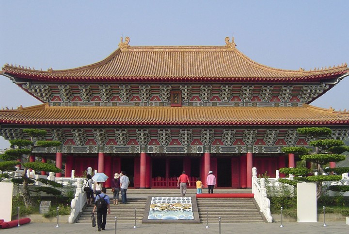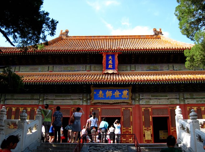 從杏壇北望,在雙層石欄的臺(tái)基上一座金黃色的大殿突兀凌空,雙重飛檐中海藍(lán)色的豎匾上木刻貼金的群龍緊緊團(tuán)護(hù)著3個(gè)金色大字“大成殿”。字徑1米,為清雍正皇帝手書。大成殿是孔廟的主殿,高24.8米,闊45.78米,深24.89米,重檐九 脊,黃瓦飛甍,周繞回廊,和故宮太和殿、岱廟宋天貺殿并稱為東方三大殿。大殿結(jié)構(gòu)簡潔整齊,重檐飛翹,斗栱交錯(cuò),雕梁畫棟,金碧輝煌,藻井枋檁飾以云龍圖案,金箔貼裹,祥云繚繞,群龍競飛。四周廊下環(huán)立28根雕龍石柱,均以整石刻成。柱高5.98米,直徑0.81米,承以重層寶裝覆蓮柱礎(chǔ),原為明弘治十三年(公元1500年)敕調(diào)徽州工匠刻制,清雍正二年火 后重刻。兩山及后檐的18根八棱磨淺雕石柱,以云龍為飾,每面淺刻9條團(tuán)龍,每柱72條,細(xì)心的工匠在石柱上記下了雕刻的龍的總數(shù),共1296條。前檐的10根為深浮雕,每柱兩龍對(duì)翔,盤繞升騰,中刻寶珠,四繞云焰,柱腳綴以山石,襯以波濤。10根龍柱兩兩相對(duì),各具變化。無一雷同,造型優(yōu)美生動(dòng),雕刻玲瓏剔透,刀法剛勁有力,龍姿栩栩如生。這是曲阜獨(dú)有的石刻藝術(shù)瑰寶,據(jù)說清乾隆皇帝來曲阜祭祀孔子時(shí),石柱均用紅綾包裹,不敢被皇帝看到,恐怕皇帝會(huì)因超過皇宮而怪罪。大成殿的建筑藝術(shù),充分顯示了我國勞動(dòng)人民的才華和智慧。 大成殿內(nèi)正中供奉孔子塑像,坐高3.35米,頭戴十二旒冠冕,身穿十二章王服,手捧鎮(zhèn)圭,一如古代天子禮制。兩側(cè)為四配,東位西向的是復(fù)圣顏回和述圣孔伋,西位東向的是宗圣曾參和亞圣孟軻。再外為十二哲,東位西向的是閔損、冉雍、端木賜、仲由、卜商、有若,西位東向的是冉耕、宰予、冉求、言偃、顓孫師、朱熹。四配塑像坐高2.6米,十二哲塑像坐高2米,均頭戴九旒冠,身穿九章,服,手執(zhí)躬圭,一如古代上公禮制。塑像都置于木制貼金神龕內(nèi),孔子像單龕,施十三踩斗栱,龕前兩柱各雕一條降龍,繞柱盤旋,姿態(tài)生動(dòng),雕刻玲瓏,異常精美。四配十二哲兩位一龕,各施九踩斗栱。龕前都有供桌、香案、擺滿祭祀時(shí)使用的籩、豆、爵等禮器。殿內(nèi)還陳列著祭祀孔子時(shí)中和韶樂樂器和舞具。殿外懸有10塊匾額、3副對(duì)聯(lián),門外正中是清雍正皇帝題書的“生民未有”匾額,殿內(nèi)正中是康熙皇帝題書的“萬世師表”和光緒皇帝題書的“斯文在茲”匾額,南面懸掛著乾隆皇帝題書的“時(shí)中立極”等匾額。每塊匾額長6米多,高約2.6米,雕龍貼金,精美華麗。