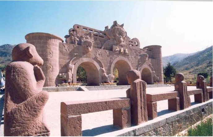 花果山山門建成于1996年7月1日。一到山門口,《西游記》氛圍便撲面而來(lái)。山門是在傳統(tǒng)古城門的骨架上,用現(xiàn)代表現(xiàn)手法加以渲染。正門上首為孫悟空的頭像,背襯圓形圖案,象征功德圓滿,法輪常轉(zhuǎn)。北側(cè)有唐僧師徒4人西方取經(jīng)的浮雕,下方有6只圓雕雄獅把門,廣場(chǎng)四周有109只石猴迎賓。山門背面的匾額上鐫“東勝神洲”四字,為中國(guó)書法家協(xié)會(huì)代主席沈鵬先生題寫。透過(guò)中間的門洞,可看到松林中吳承恩雕像。