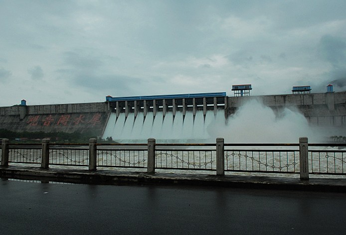 觀音閣水庫(kù)是一座以防洪、供水為主,兼有灌溉、發(fā)電、養(yǎng)魚(yú)等綜合利用的大型水利樞紐工程。主體工程1990年5月開(kāi)工,1994年落閘蓄水,2000年11月竣工。工程總投資23.19億元。控制流域面積2795平方千米 。工程為Ⅰ等工程,主要建筑物為1級(jí)建筑物,按千年一遇洪水設(shè)計(jì),萬(wàn)年一遇洪水校核,總庫(kù)容21.68億立方米。攔河壩為碾壓混凝土重力壩,共分65個(gè)壩段,由攔河壩段、溢流壩段、底孔壩段和電站壩段組成,最大壩高82 米,壩頂長(zhǎng)1040 米,寬10 米。