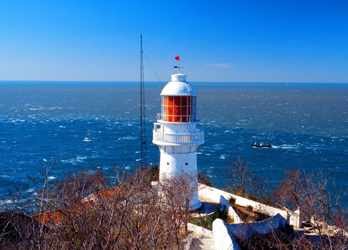 旅順口最南部的老鐵山西角,是遼東半島最南端。老鐵山山峰高度200米以上,主峰——大崖頂海拔465.6(465.5)米。山前黃渤二海匯合處,與相距57.8里的山東半島蓬萊角隔海對(duì)峙,遙遙相望。