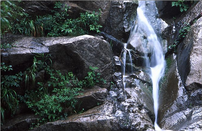 伏虎瀑。谷中斜臥一巨石,如猛虎伏地,流水輕漫而過,似虎身斑紋。